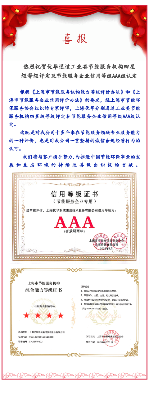 热烈祝贺优华通过工业类节能服务机构四星级等级评定及节能服务企业信用等级AAA级认定