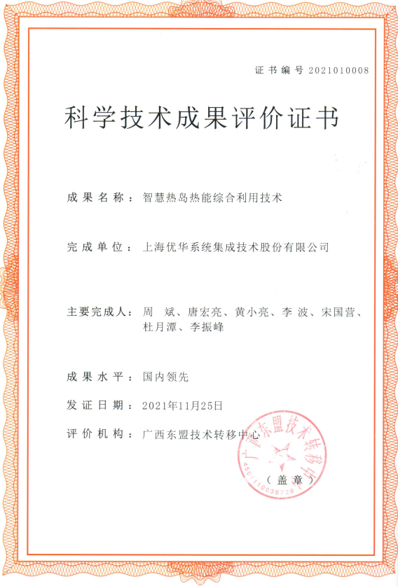 智慧热岛技术2021年入围工信部国家工业节能技术推广目录。同年广西科技厅广西东盟技术转移中心组织有关专家对“智慧热岛热能综合利用技术”科技成果进行了评价,评价结论为该技术达到了同类研究国内行业领先水平。