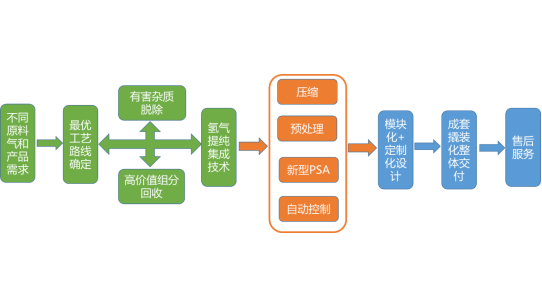 通过整合各种先进、成熟的工艺技术,选择最优的工艺技术路线,开发了各种先进成熟的硬件设备、控制系统和嵌入式工艺技术于一体,模块化撬装供货,生产出质优价廉的工业氢或氢能产品,满足了不同用户需求。