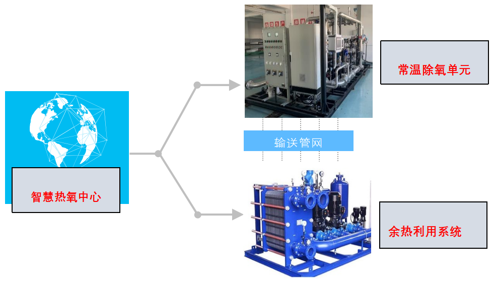 智慧热氧中心核心设备为智能优化控制系统,集成有大数据库和系统优化计算模型。模型通过实时数据自动优化控制,在变工况下保证溶解氧合格及稳定,确保系统供出除氧水温度满足用户需求。